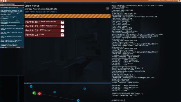 If you take a random server in Hacknet, you’ll usually be presented with a login prompt and the ability to “probe the network”. Almost always you will have to probe the network, from there the game will tell you what type of security measures the servers have. It might be a proxy server that you have to overload with other servers or a Firewall that means there’s an analysis program you have to run and figure out a passcode by reading off the letters that remain after analysis. You’ll almost always have to open ports on the system so you can crack the password, and you open ports by running exploits. Almost all of this is only done through the console. You can probe with the mouse, but the exploits require running the programs manually and giving them the ports.
