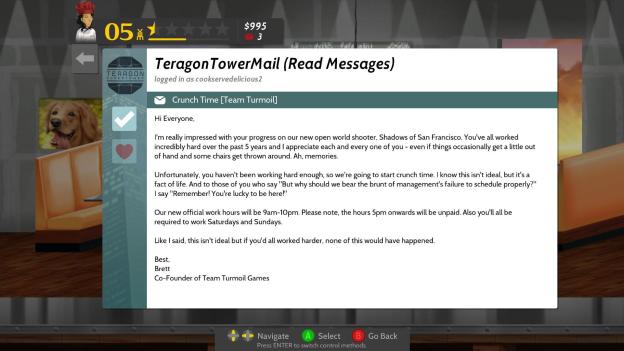 The email system feels a bit weaker. There are not as many interactables with the email system. I didn’t see any email I could respond to, but you get emails that are from people in the office building you work in. Most are ok, but the crunch jokes hit a little close to home. However, you keep getting free stuff in the email (don’t know exactly what triggers that but they come far too often). There’s just less overall reason to read the email outside of collecting those items.