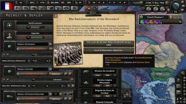 There are historical events that happen. Early on, Germany enters the Rhineland and the 1936 Olympics happen. Many of these events have a minor influence on the game. Germany can be rebuffed by France for entering the Rhineland. That act is a prelude to one of the big early decisions which lead to when Germany and France begin the war. There are a number of ways to do this as France can take offense at Germany early, but as a country, it is a very weak power early in the game. France will get stomped if you let it.