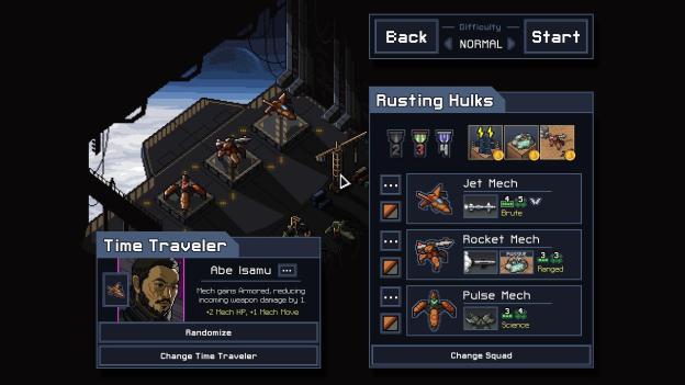 This is the entire gameplay loop. You choose a team and a pilot, drop in, play as much of the game as you can, potentially winning but ultimately restarting again after the end of a timeline. You’re allowed to carry over one pilot from your mechs, and then you drop in again. It’s a simple cycle but very effective. It keeps you wanting to play more because you think about the reason you lost, or a small improvement, or a new tactic that you’ve come up with.