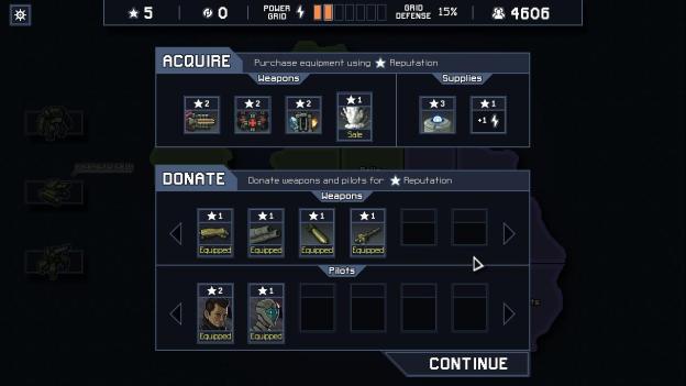 Reputation is the currency of each island in the game. Apparently, the fact you’re facing a monstrous race that is going to destroy the planet isn’t a big enough emergency for the corporations, and they charge you for every favor they do for you at the end of an island. You can spend your reputation after the final battle at the HQ, depending on how much reputation you gathered. There are power cells, additional grid power, and a number of weapons for purchase. It’s a system that heavily incentives beating the objectives instead of only worrying about Grid Power and your mech, though sometimes you may have to trade one for the other and make a hard choice.
