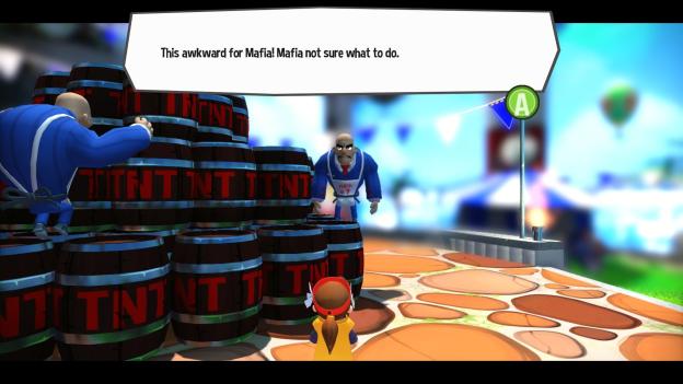 The first world is based on the Mafia and there’s a number of different levels in that world, each one giving a little more style and story to the world. In Mafia world, you’ll start by getting your first hourglass and your weapon (an umbrella), but then will save a new friend on the second levels and later, turn off faucets spewing lava, and more.
