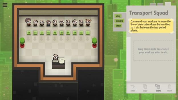 The core of the game, however, is instructing humans how to solve simplistic tasks such as lining up data cubes, writing new data cubes, using printers and shredders and more. The player is limited in how they can instruct the humans, and the game slowly gives the player more and more instructions with which to write their scripts.