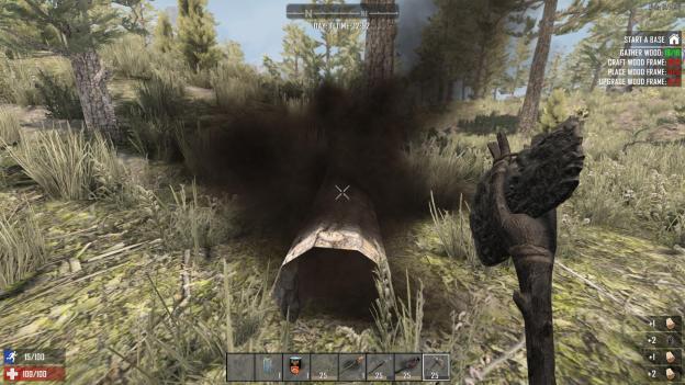 The thing is, 7 Days to Die is about survival, which means scavenging is the point of the game. There are zombies walking around but that’s about it, and you can easily avoid them as you play the game, and scavenge. Sadly it’s hard to find stuff to scavenge, as sometimes loot boxes are hard to find. In my first look, I had a lot of trouble trying to find a bird’s nest and probably walked by a few of them. In later games, I found them often because I knew what to look for. Trash piles work, but there are backpacks and purses that are hard to find.