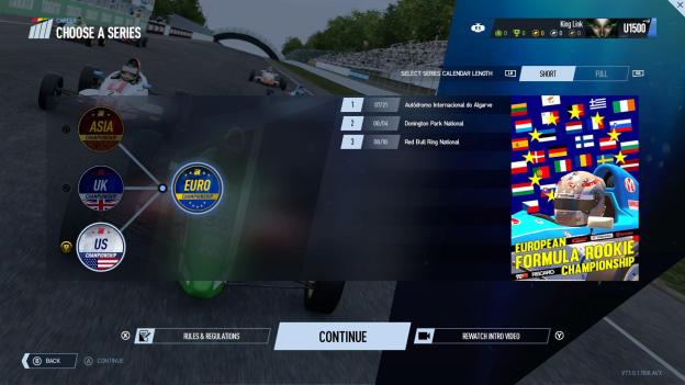 From there you can choose your championship, including the ability to make it a short season (half or fewer races), your team (which doesn’t appear to change much in the races I chose, just the livery) and then you’re committed.