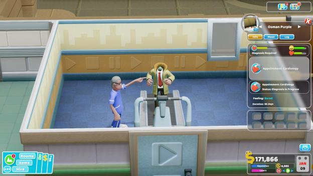 From that point, it’s mostly about running the hospital and improving the efficiency of the hospital. As the hospital grows, the hospital is run well, and certain events will cause the hospital’s level to grow, and that causes more patients and a new variety of them for the player to manage. This will add new challenges such as a new disease, but the game also has a limit to how many people can use each location or resource, and ultimately, the player will have to deal with lines at the general practitioner’s offices by adding more or having new treatment options for new maladies.