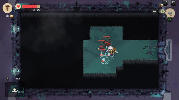 Moonlighter sets up a Zelda-esque combat system, where the main character can block attacks, as well as swing his weapon to cause damage. There’s also a very effective dodge roll that allows Will to avoid almost all damage and dodge through enemies if necessary. Outside of that, the entire game is basically exploring the dungeon with combat and dodges.