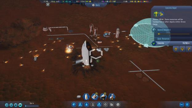 Surviving Mars is all about building a working colony on Mars. This starts with the player landing a shuttle, several drones and beginning supplies to set the player up to start. From there you need to start building an early base. This means everything from generating power to gathering metals and getting a stockpile of concrete. Each of these tasks requires a different strategy or maneuver, but almost any player will be able to complete them to get the early game going.