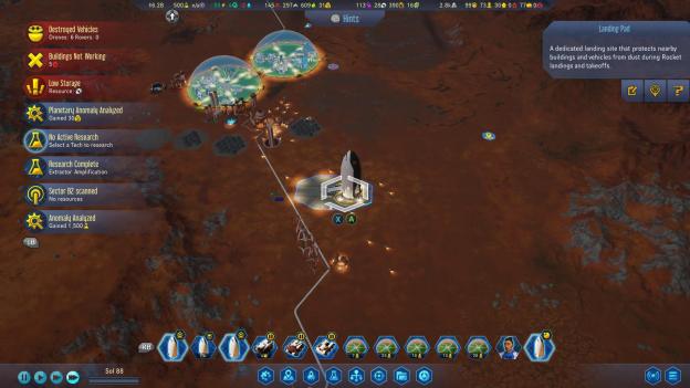 The biggest issue I have with Surviving Mars is how overly active the beginning is. Most city and base builders are active with planning or preparing the early stages of the game. Players have the starting money and resources and need to start building the initial generators of funds. While I do prefer an active city builder than a passive one, Surviving Mars though focuses on sending your transport vehicle out to gather ore manually and return it as well as sending your remote explorer to research anomalies. This doesn’t change throughout the game. The number of metal ore your base will be able to directly reach is low, so the player will have to actively gather resources.