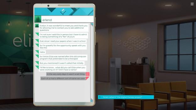 Thus we come to the story. Now when this game was announced, and in my preview, I mentioned that this game is based on the Eliza program from the 60s, where they tried to simulate speech and produce a therapist from computers, and the fact is that is one of the purposes of the name.