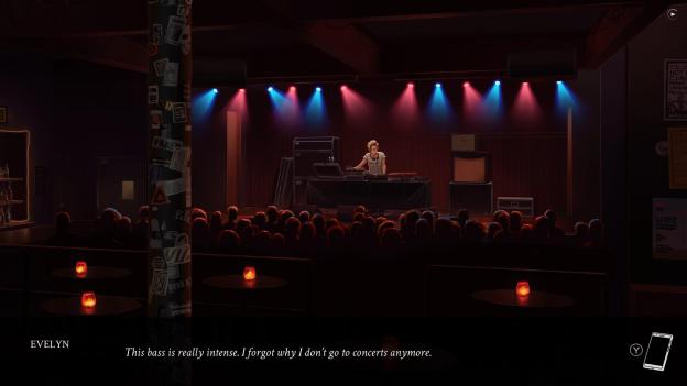 Each character has their own philosophy, here Nora plays an electronica concert.