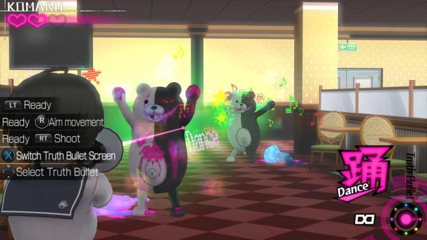 Danganronpa Another Episode focuses on third-person, over the shoulder shooting. All the enemies are based on different variants of Monokuma and each takes large lumbering attacks at the players trying to attack them.