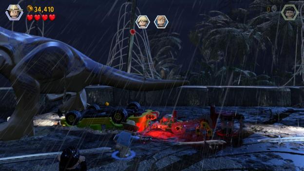 Besides, while the minifigs are well designed, and each character looks amazing as a small Lego version of their movie persona, the portraits informing you which character you should switch to is weak. There are several black haired white males and it’s not clear which one the game expects you to use. Is it Denis Nedry, Nick Van Owen, or Ian Malcolm.